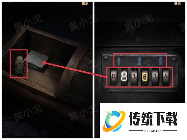 28、点击棺材里的盒子上的密码锁,根据上面的图案提示,结合各场景中对应物品的数量,输入密码:08 10 14