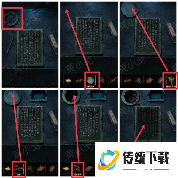 31、点击石桌,拿开破砚台,放上【现代盘子】,倒入【盛满水的方鼎】,放入【砚块】和【现代刷子】,铺上【黄纸】