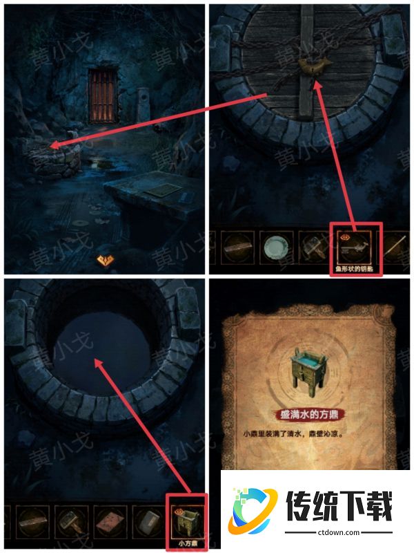 30、用【鱼形状的钥匙】打开水井上的锁;再用【小方鼎】装水,获得【盛满水的方鼎】