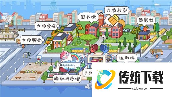 2、大学宿舍、大学食堂、图书馆、大学教室、话剧社、滑板游泳馆、击剑拳击馆,运动场;