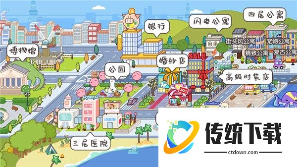 6、博物馆、公园、银行、闪电公寓、四层公寓、婚纱店、高级时装店、三层医院、服装折扣店、家具店;