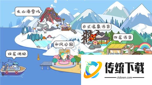 7、火山滑雪场、日式温泉酒店、四层酒店、双层游轮、和风公园;