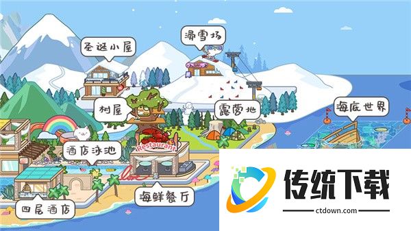 8、圣诞小屋、滑雪场、树屋、露营地、海底世界、酒店泳池、四层酒店、海鲜餐厅、海上派对;