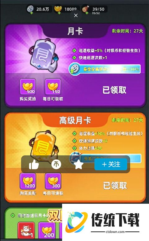 第一个就是月卡,月卡还有高级月卡和又月卡,标准都在游戏页面中说明的