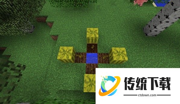 如图所示,这是一种错误的种植示范,这种种植方式只有最外层并且与泥土方块没有高度差的瓜藤才有可能结出果实。