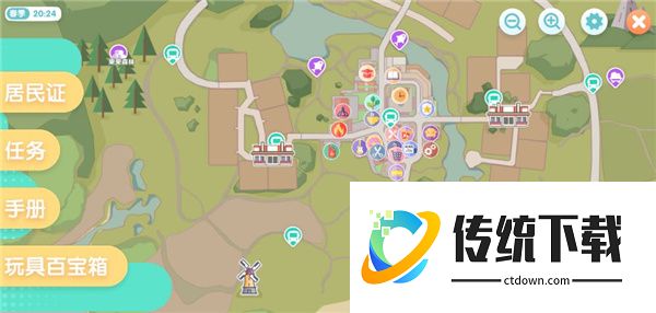 1、进入游戏后,点击屏幕右上方的菜单按钮,即可看见小镇的完整地图(看到图中的公交车标志了吗?那是真的可以传送的哦);