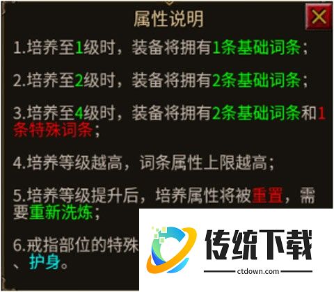 拥有:常规装备属性战力(固定)+词条洗练属性战力(浮动),培养等级越高,词条可洗练属性越高,属于进阶装备。