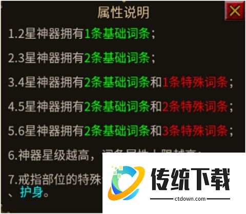 属于最高级装备,玩家通过开(获取途径:找玩家收或者爆——野外世界行会亡魂福利BOSS、野外小怪、活动)神器宝箱(开一次100金元,获得50神器碎片和随机价值6-50RMB的材料),获得神器碎片。在神器兑换界面,消耗神器碎片兑换神器。兑换的神器为神1等级,需要二合一的方式,逐级合成,最高合到神6等级。神器要么不玩,要么至少玩神5。因为神5就有2个基础词条和2个特殊词条,对比同等级其他装备优势就开始明显。(现版本大幅加强了神器,可以引导土豪做神器。神豪可以引导做全身神6)