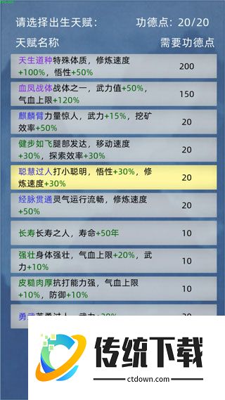 1、开局:选人皇血脉,然后选天赋,需要功德点,可以看广告(只有一次)得50功德,加上开始的5点,55点,选一个单灵根天赋,然后其他四个天赋选加修炼速度的,自己凑一下。