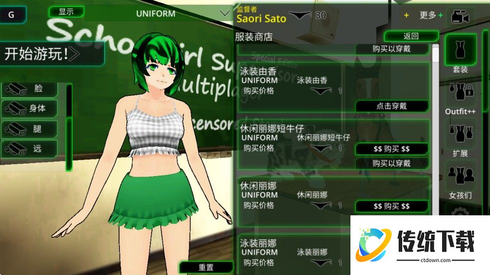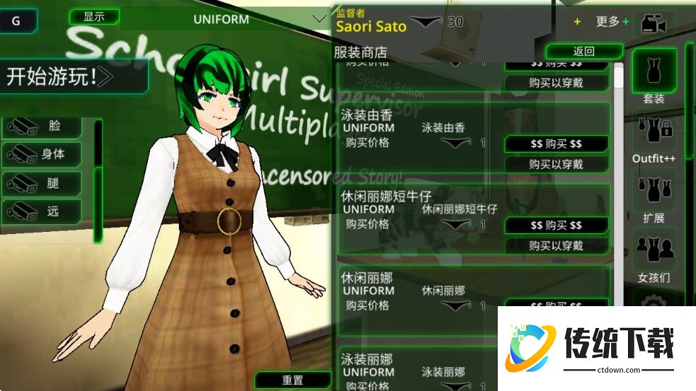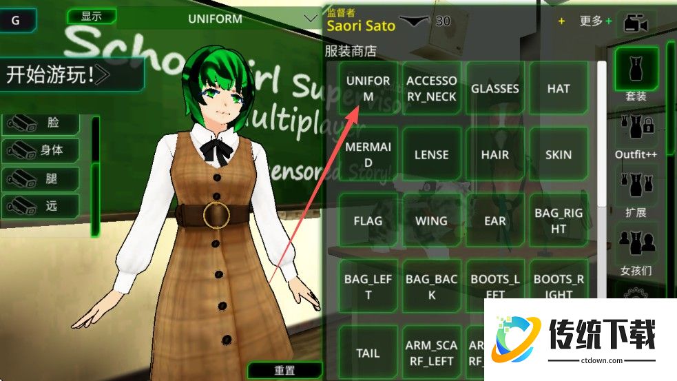 1、打开校园女生监督会汉化版游戏,点击【套装】