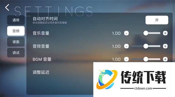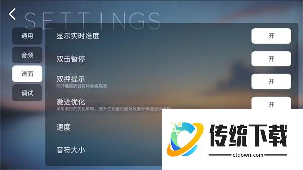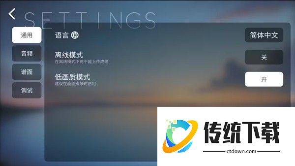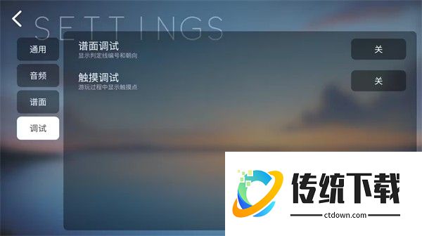 设置共分为5大类,“通用”,“音频”,“谱面”,“调试”,“关于”
