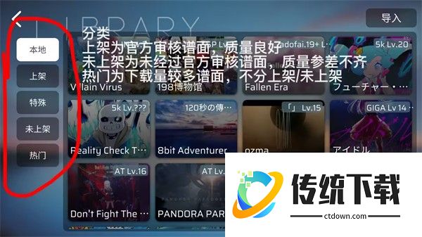点击右上角导入按钮可导入本地下载谱面
