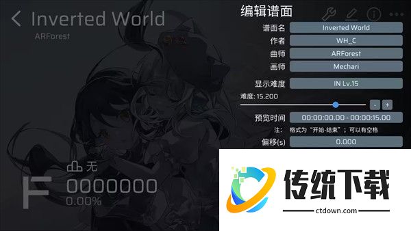点击铅笔图标,屏幕右边出现谱面设置界面,这里可以调节谱面定数,宽高比和Tip等,请自行调节(记得保存)