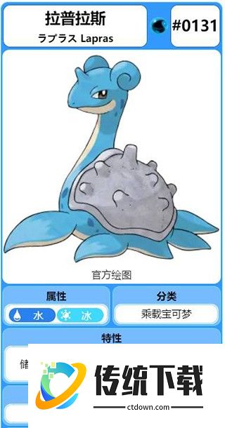 拉普拉斯是水属性和冰属性宝可梦,拉普拉斯是头脑聪慧,心地善良的宝可梦。它十分耐寒,不畏冰海。它有着可以理解人类语言的高智商,喜欢乘载着人在海上前行,心情好的时候似乎会用美妙的声音唱歌。在阿罗拉地区,这是重要的水上交通方式。