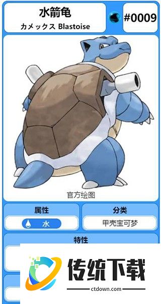 水箭龟是水属性宝可梦,水箭龟是一种以两足行走为主,体型巨大的龟形宝可梦,它有时也会用四足行走。水箭龟身体呈深蓝色。它的前后肢短而粗壮,因关节而分成一节一节的,并且都长有三趾。