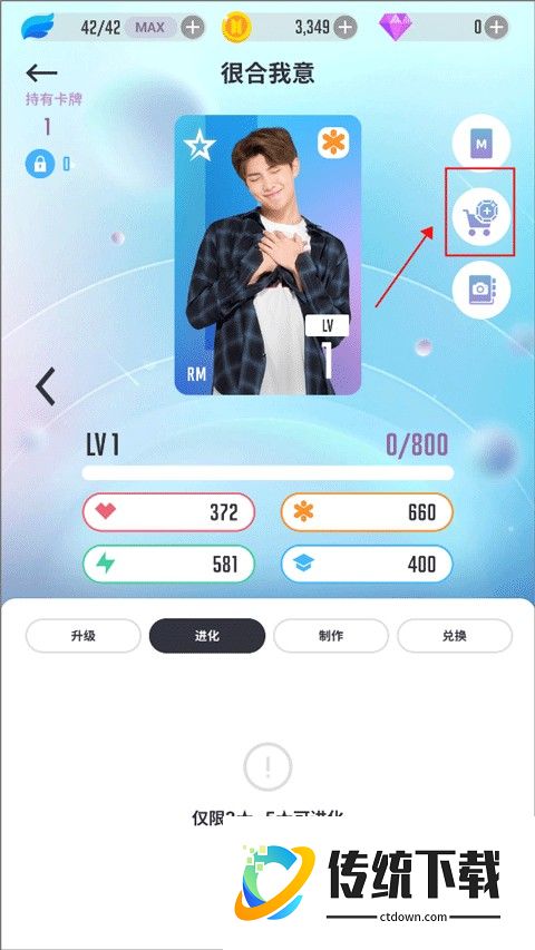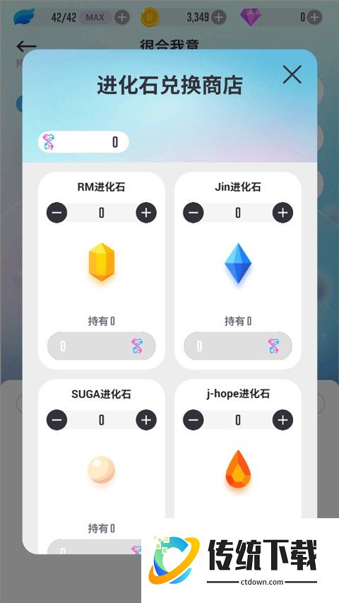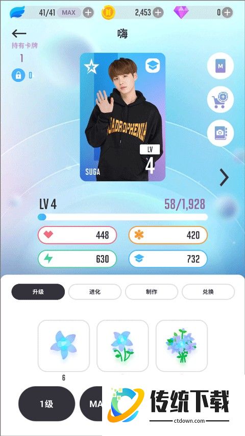 5、兑换。同样的卡片总有一张以上才可以兑换多余的那张,兑换给卡片相对应的成员进化道具,升级卡牌的花和 DNA 。