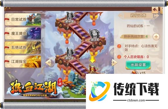 3、每个玩家都能够通过一次次的试炼任务来获得强大战力征服这片江湖世界。