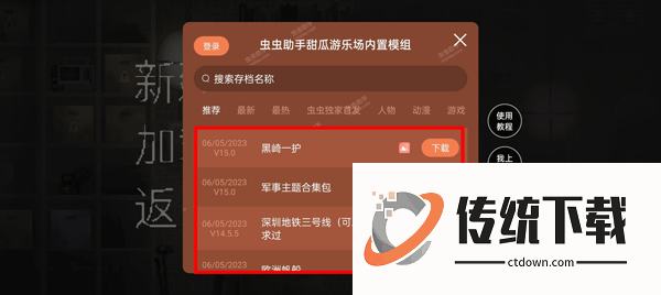 1、进入游戏点击打开虫虫助手模组,选择一个模组然后点击下载,下载完毕之后点击使用;