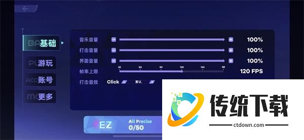 3、进入“基础”界面,可以对游戏的音量进行设置