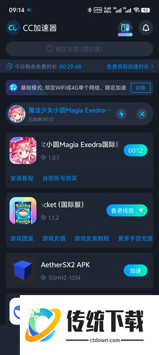 1、首先下载安装魔法少女小圆Magia Exedra游戏,安装完成后打开手游加速器(如CC加速器、奇游手游加速器),找到这个游戏,点击加速;