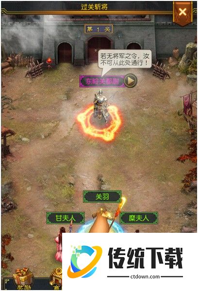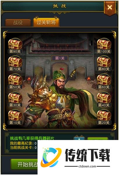 1. 过关斩将总共有100关,每关都会有一个守关将阻碍关公的去路,点击守将即可进入备战界面,战胜此人才能继续通关。