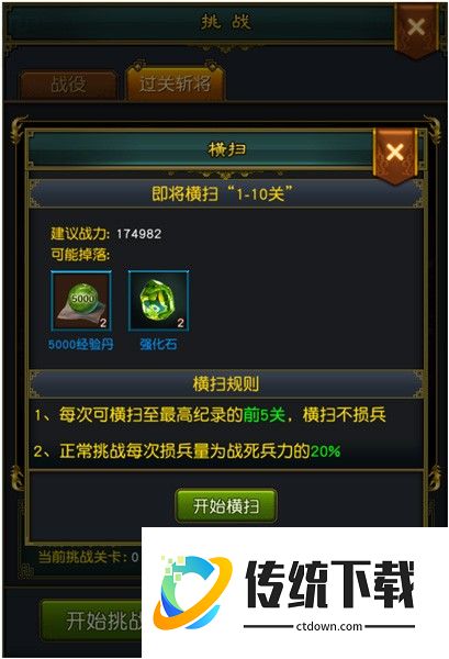 2.不过每次横扫只能到达玩家最高通关记录的前五关,之后还是需要进入关隘手动挑战。
