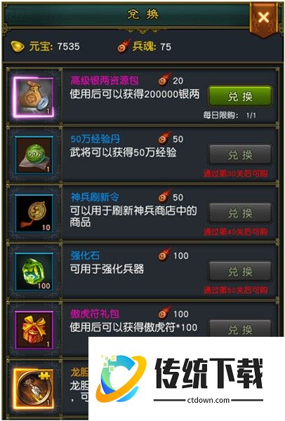 1. 每次通关都有可能获得兵魂,使用兵魂可以在过关斩将商店中兑换各种有用的道具。