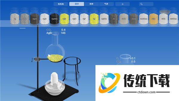 2、摆好了器皿,接下来可以点击“水滴”选择各种各样的化学原料了。软件提供了化合物、固体颗粒、液体和气体四大类原料,选择相应的化学原料会显示其相关化学元素。