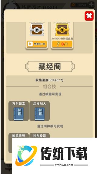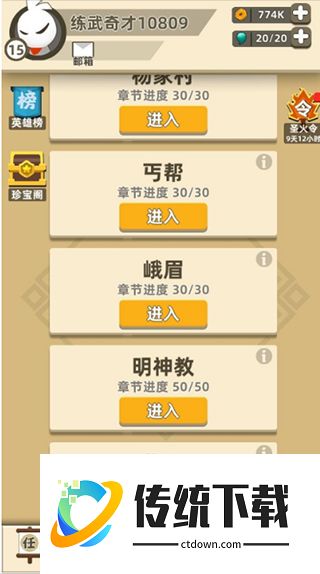 1、打开手游我功夫特牛内置mod菜单版,首先需要通关明神教,这样点击左边的珍宝阁就可以看到组合技追踪炸弹