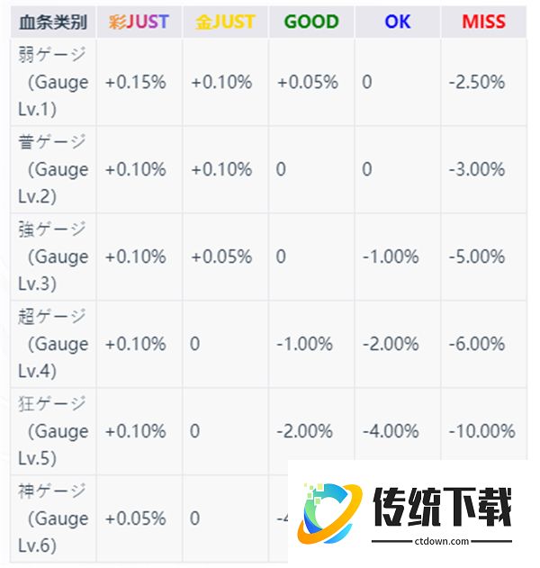 在活动模式与段位模式中,游玩歌曲会出现对应的血条(ゲージ、Gauge)。血条初始状态为100%(满血条),会随玩家游玩时打出的音符判定而变化(最高不会超过100%),血条降为0%时会导致通关失败。游戏中共有6种不同的血条,各级别下,打出各判定的音符,对应的血条变化如下表所示: