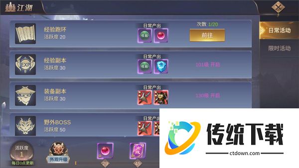 如果一路跟随主线剧情去走,直到第一次任务卡等级的时候,人物角色差不多会升到60级左右,此时游戏中也已经解锁了丰富的日常活动玩法。在这一阶段想要继续快速升级,主要方法就是完成各种各样的日常任务。逆火苍穹游戏设置有经验跑环、野外boss、装备副本等多种日常活动,各位新手玩家在做日常和升级的同时,也能充分了解这些日常的玩法。