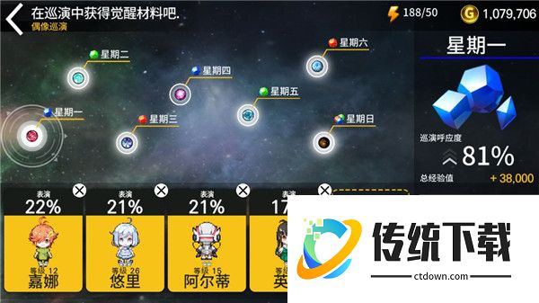 3、我们如果需要蓝色的材料的话,可以选择周一或周四巡演,然后选择偶像式系统会提示哪个偶像契合度更高。这里要注意的是,巡演过程中偶像是不能参加比赛的,也不能再安排日程。所以具体要怎么安排偶像巡演,可以根据你自身的需要选择。我的话,一般是不打比赛比如手机充电的时候,会安排巡演,选择系统显示契合度最高的偶像。