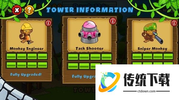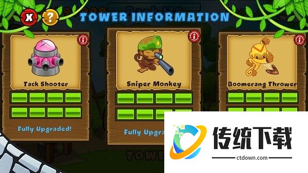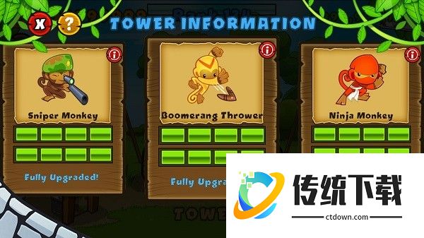 狙击手猴全屏幕射程,射速慢,初始每枪穿透两层气球,建议点击后选择“strong”攻击模式。