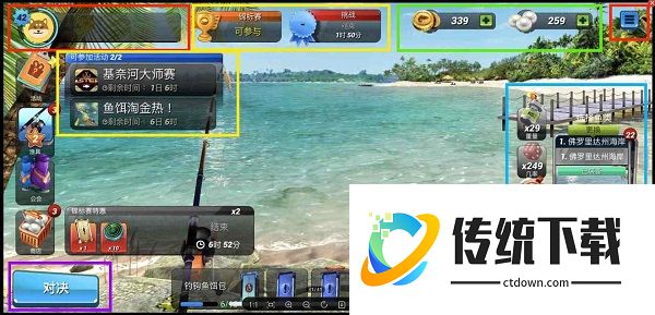 4、一年四季钓不停,在实时PvP中与其他玩家同场竞技。
