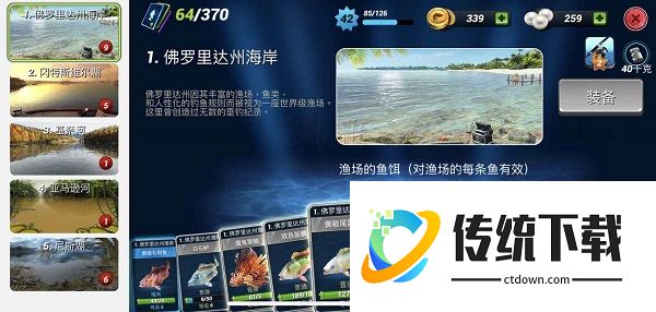 像是进入游戏后前往的第一个钓场,有着丰富鱼类的【佛罗里达州海岸】