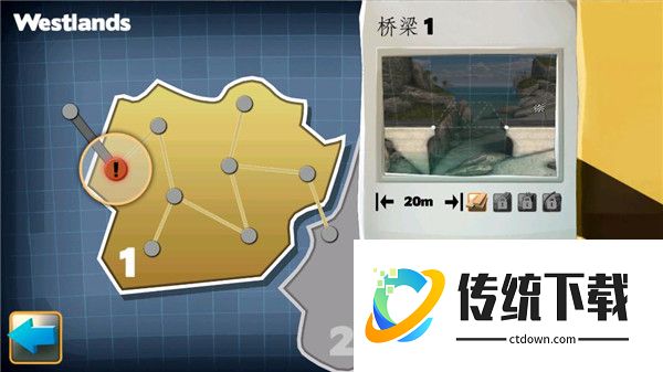 每一关开始时都会有如下图所示界面出现,右上方会有要建的桥的地理位置显示,下面会有桥身要横跨的距离标识;同时,本关卡可以用到的建筑材料也会显示出来。修建时要注意的是,所用材料是要消耗预算的,每一关在屏幕上方都会有预算数字,超出预算就不能修建了。