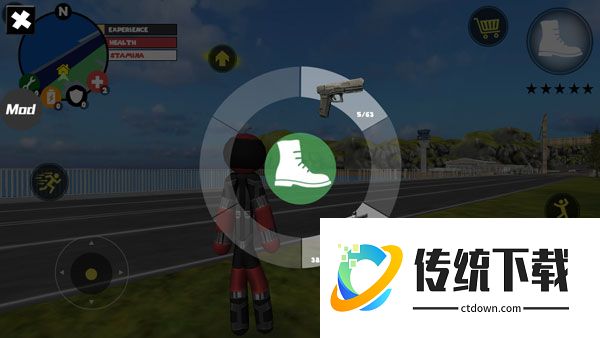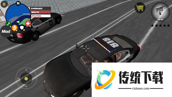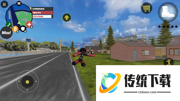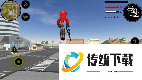 左侧移动、加速,右侧绳索,攻击(跳跃),跳跃,右上侧的武器更换以及血量、经验的显示都实时更新,一览无遗,凭借着大家自由的玩法,与其他帮派的人物进行交火,期间杀人能够获得经验,杀多了会产生星级,警察和其他附近角色会特殊照顾你对你展开火热的进攻,而如何存活,如何将其他人物击杀则是你所需要完成的任务。