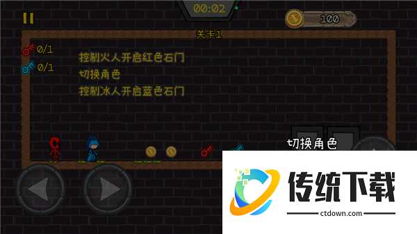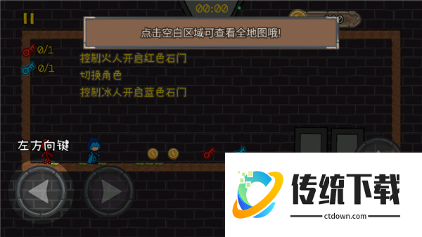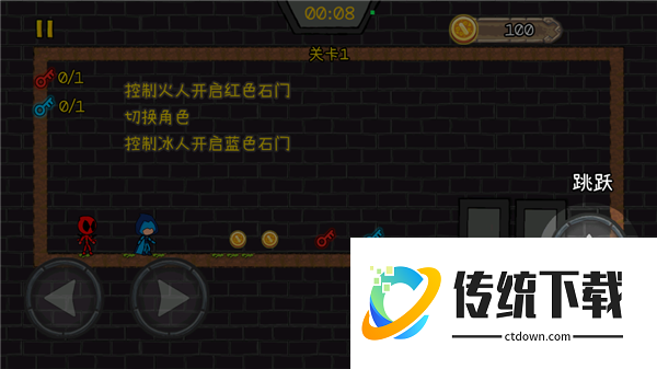 4、然后向上的按钮是可以进行跳跃的哦,你需要做的就是控制火人开启红色石门,其中也有切换角色的操作,在控制病人开启蓝色的石门。