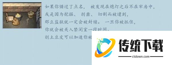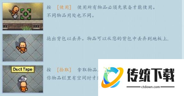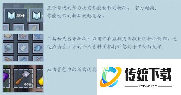 在监狱里,你要开发你的创造力,使用有限的工具来制作各种道具。你可以将日常用品(如肥皂和袜子)组合起来,制造新的武器和工具,以帮助你实现目标。也可以从自助餐厅偷盗叉子,在房间里铺一条隧道,并通过杂志和胶带制作海报以隐藏痕迹。你将很快了解到,胶带解决(几乎)一切!