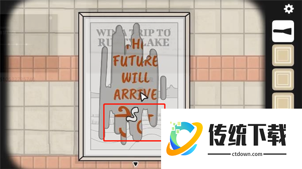 6、在婴儿车旁边的场景里有一张海报,用铲子把海报刮烂,就看到“THE FUTURE WILL ARRIVE”,也就是未来即将到来的意思。然后海报底部会出现一个神秘符号。