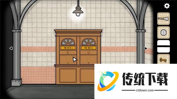 11、然后我们去到垃圾桶旁边的售票处,用钥匙开门,用水管敲击门框,叫醒售票员然后和她互动,提示我们需要一枚硬币。