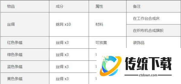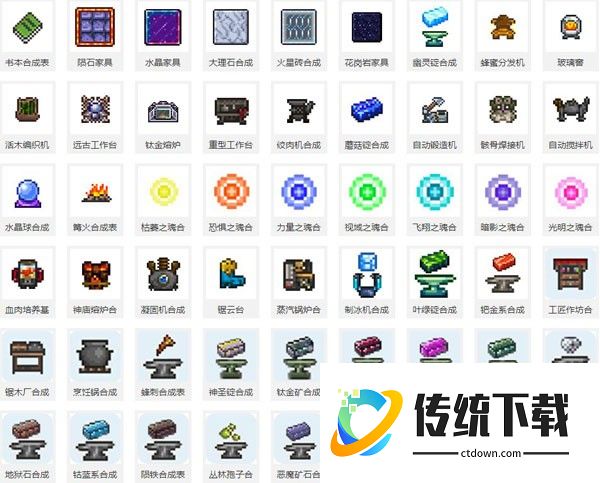 泰拉瑞亚合成表分为水合成、织布机合成、工作台合成等多种合成方式,玩家可以根据自己的需要来合成相应的物品,每中物品合成时所需的材料和消耗的内容都有详细的说明。