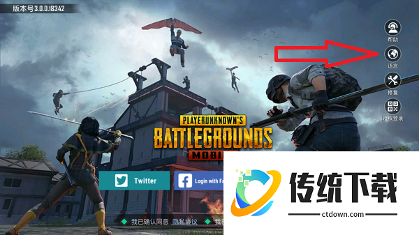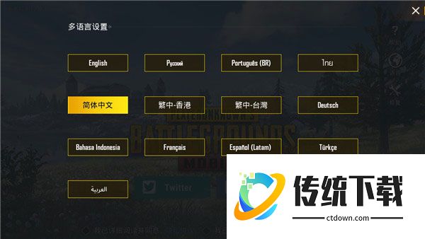 2、PUBG国际服手游语言可切换,在右上的一个地球图标内可以进入语言栏进行十二种语言切换;