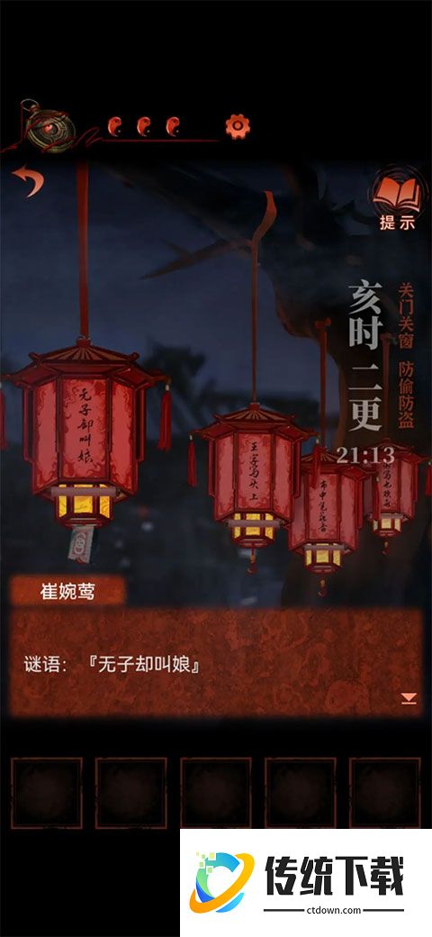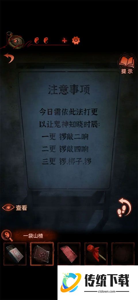 8、中间场景的告示牌,点右下角那个可以变化,得到线索。接着就可以去敲左侧场景白无常手上的铜锣。(几个灯笼亮代表几更)