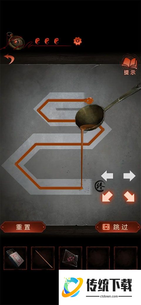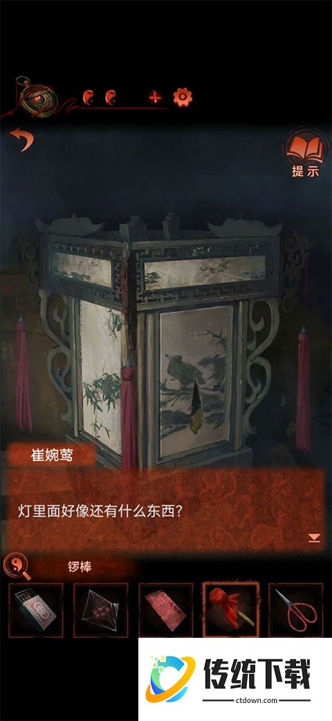 得到发现灯笼的线索,来到中间场景,按顺序左中左左右左得到剪刀和金元宝。