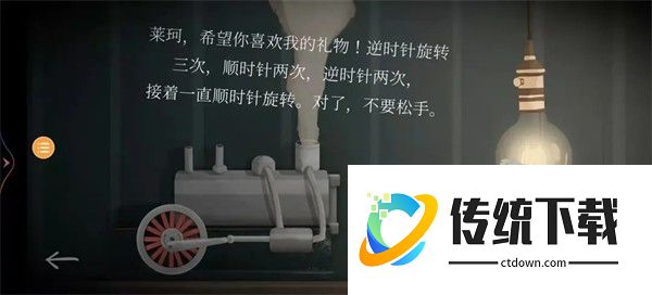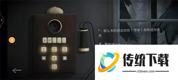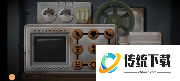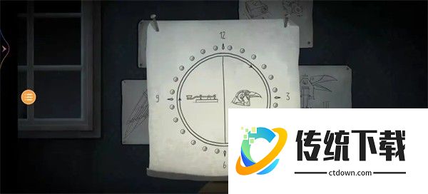 22、第三章时间来到1937年,第一个场景变了,所以我们不需要去看时间,注意:不要随意点击灯泡!!!来到钟表店,虽然是关灯状态,但是我们在第二章有了钥匙,可以随意进出。这次玩家一和玩家二的场景一致,进入钟表店后向下滑动,看到一台发电机,左侧的显示屏旁边有九个按键,游戏将它们从1~9依次编号,无论如何变换位置,1~9的位置是不变的,所以当它每次转动后,每次的1都不是一个按键。右侧开始后,玩家一率先有提示,之后便是玩家二有提示,一共18次,每人9次。