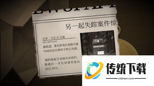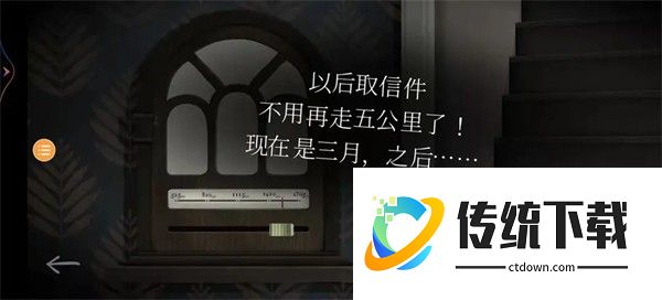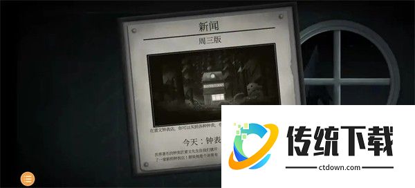 10、玩家一和玩家二都可以看见收音机,调频,相互沟通,先是玩家一后为玩家二,得知线索。玩家一:得知现在是三月。玩家二:得知雷文钟表店今天也就是18号,开业。向上滑动,看见报纸,得知今天是周三。