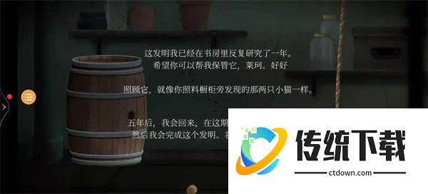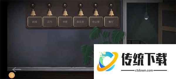 14、向左滑动,来到别墅,进入。玩家一:打开门,下滑下楼,点开酒塞,点击绳子,点击右侧玻璃罐后的壁虎,等它爬到左侧后,再次点击,直到壁虎进入笼子。至此三条信息全部出现。玩家二:花盆下纸条得知,需要按规律敲铃铛才能进入下面的场景。