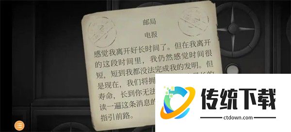 25、来到邮局。玩家一:看到电报机,一共十个密码,可以选择长和短。玩家二:根据上述线索,将指针指向南、东南、东北、东北,打开箱子,得到一份电报。