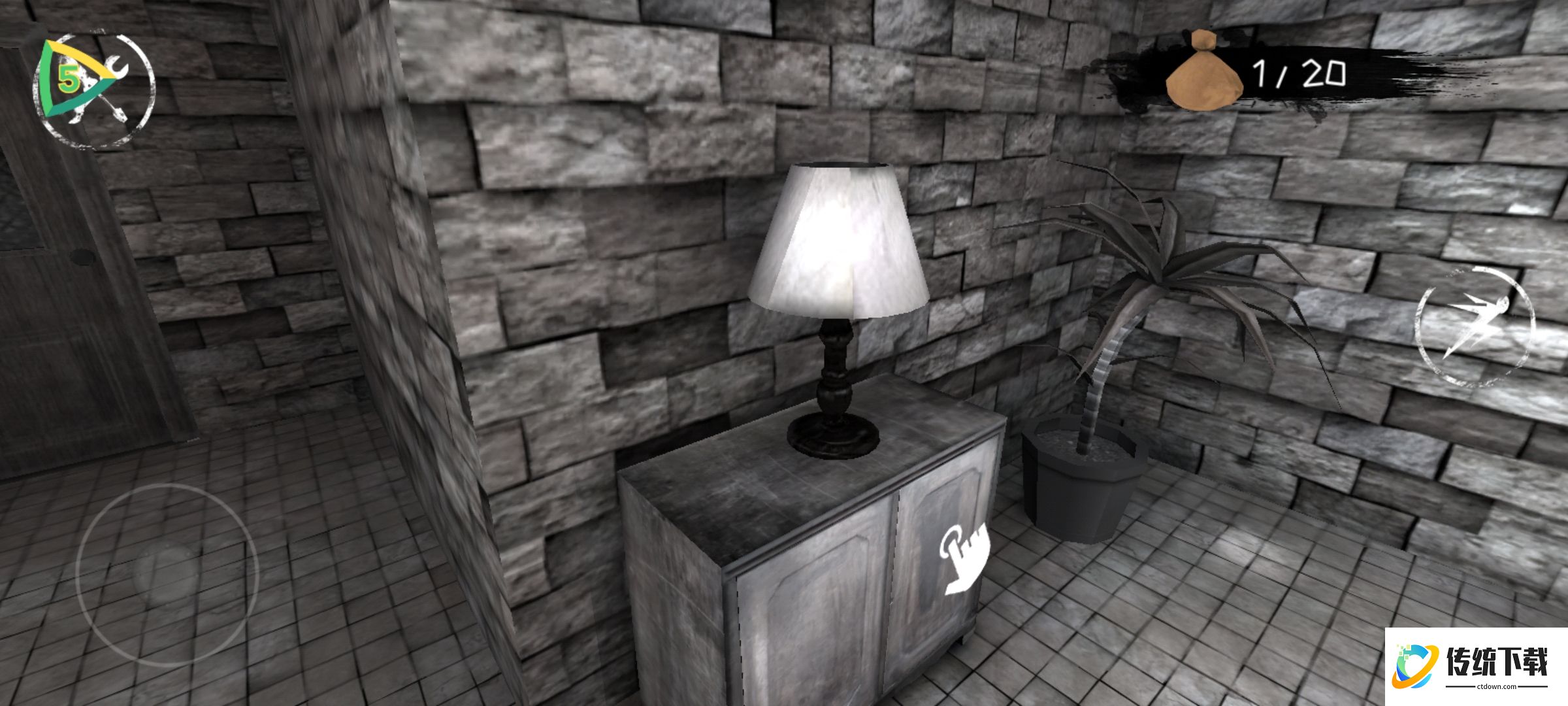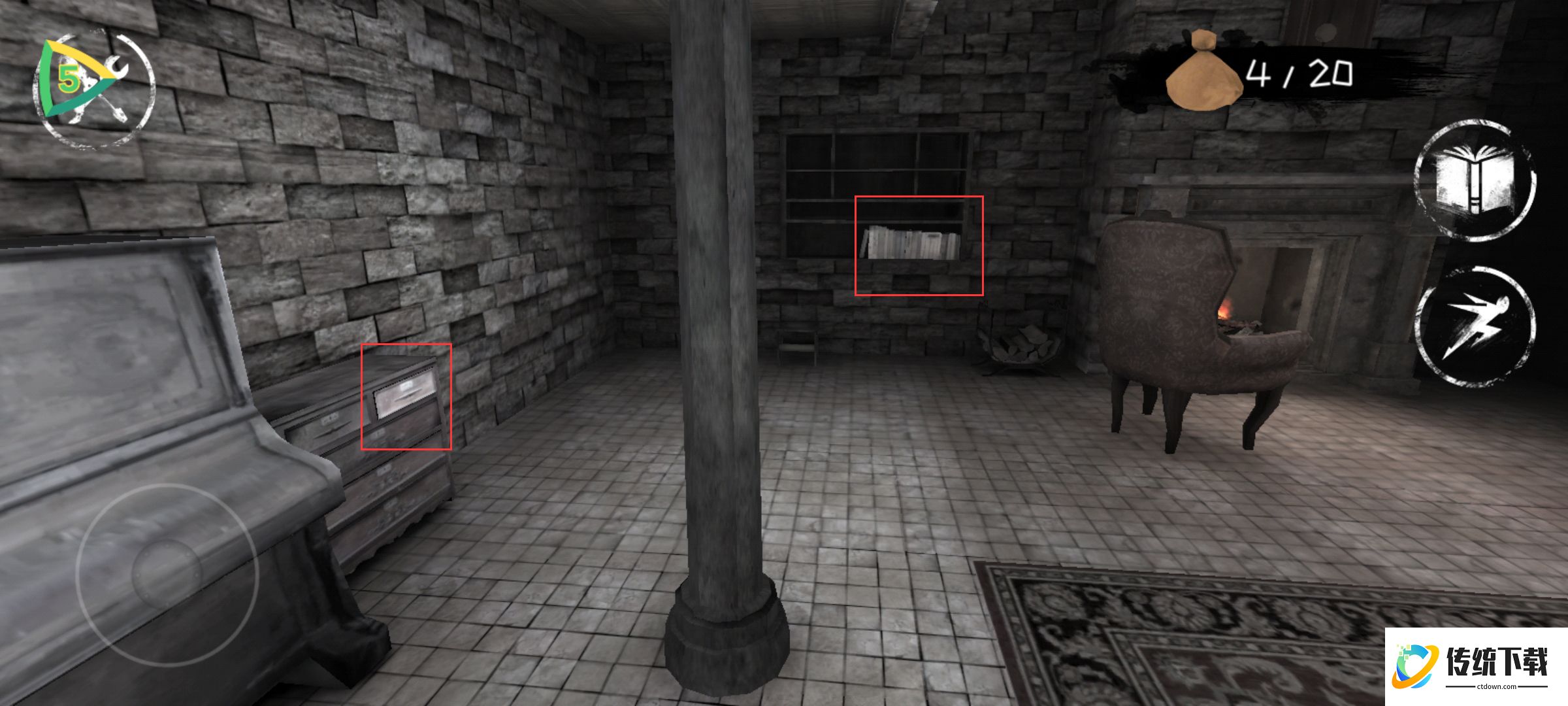 2、做完这一些后我们使用眼睛观察女鬼的位置,等女鬼进入地下室的时候,我们就到楼上去,在二楼时玩家们总共大概可以搜集到十八个钱袋和五个左右的眼睛,接着使用眼睛,等鬼到到地下室的时候我们回到开始的客厅,趁鬼上楼我们就去地下室。